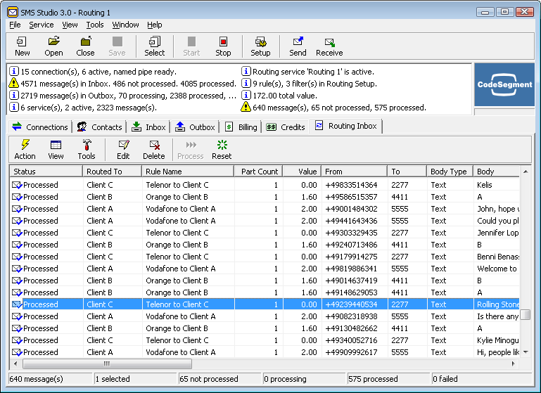 Sophisticated filtering and routing options allow you to create any routing configuration you may need. Depending on various criteria (e.g. message prefix, short code, incoming account, sender, recipient...), incoming messages are processed and forwarded to their destinations. SMS Studio does not impose any limits regarding the number of connections you may establish or the number of routing rules you may use. Support for parallel connections and load balancer gives you the full power to manage heavy traffic with virtually any SMSC.